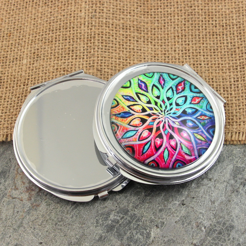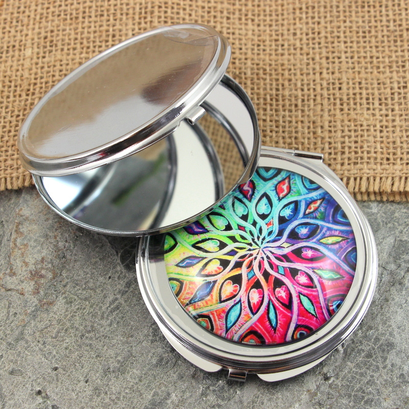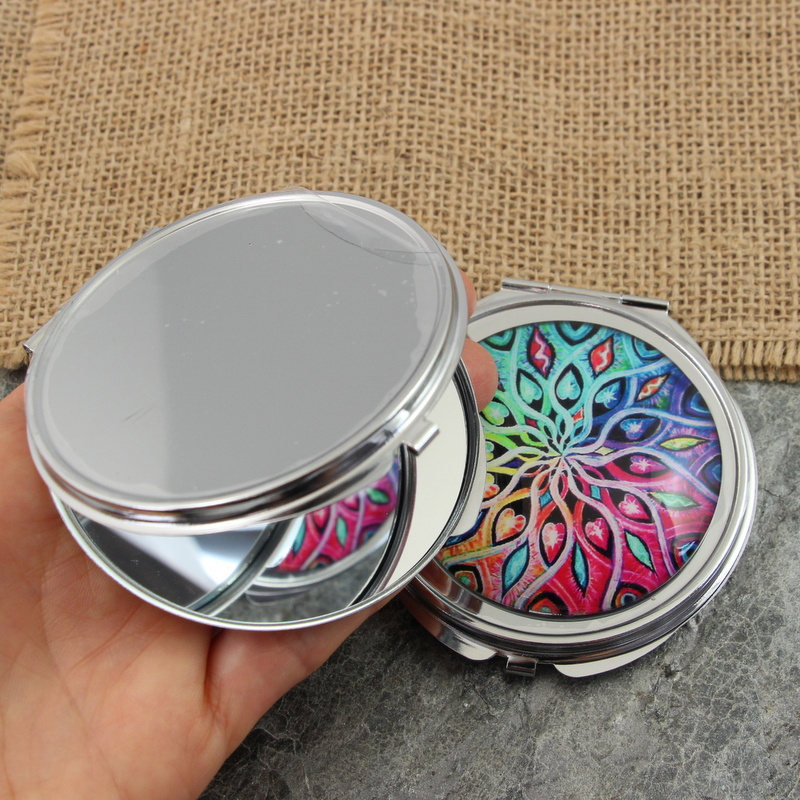 Baza składanego lusterka. Na wierzchu miejsce do ozdobienia -  wklejenia kaboszonu, elementu haftu koralikowego, sutaszu, własnoręcznie wykonanego elementu z masy termoutwardzalnej, mini mozaiki, lub do zalania żywicą. Idealny pomysł na własnoręcznie robiony prezent dla bliskiej osoby.