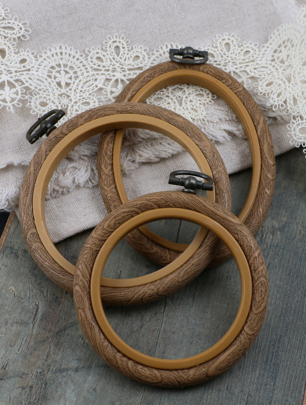 Ramko-tamborek do haftu. Tamborek może także służyć jako ramka do zawieszenia gotowego haftu. Tamborek wykonany z tworzywa, fakturowany, imitujący rustykalne drewno, wyposażony w zawieszkę w kolorze antycznego brązu.