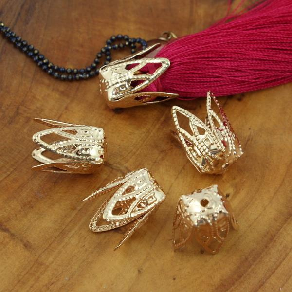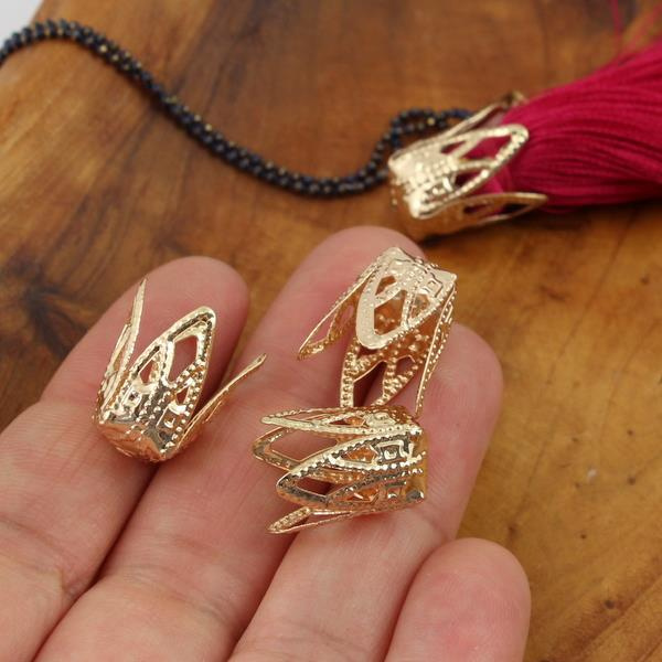 OpisOzdobny, ażurowy koszyczek w kolorze złotym. Można używać do chwostów, wstążek Sari i tekstylnych kwiatuszków.