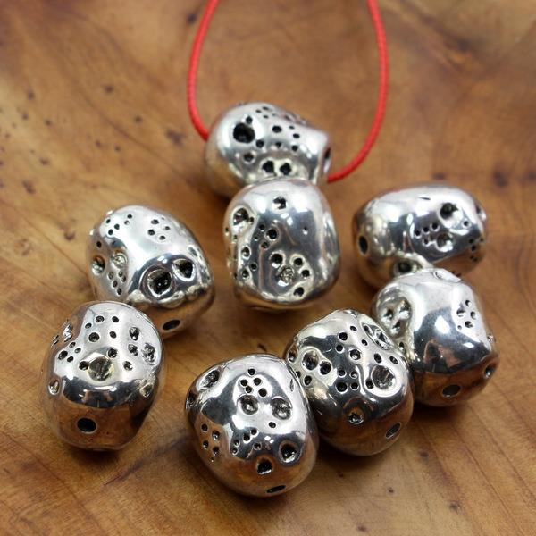 OpisDuża, ozdobny element nieregularny z szerokim otworem na sznurki i rzemienie. Bardzo lekki, więc z powodzeniem może być stosowany do naszyjników i wisiorów, nadaje się też na kolczyki.