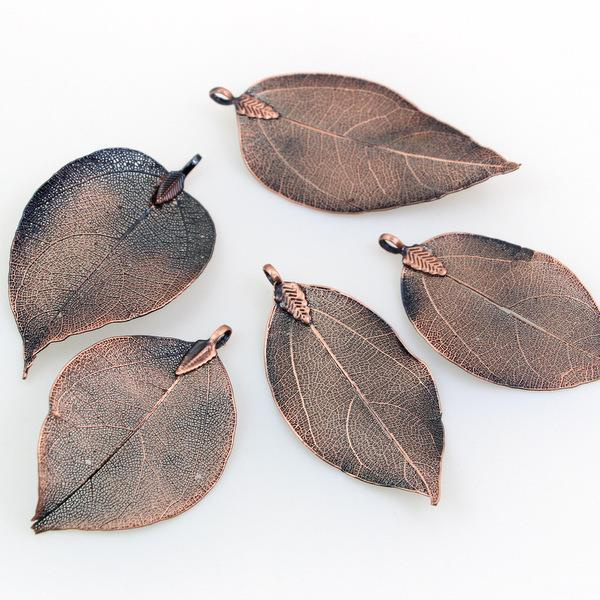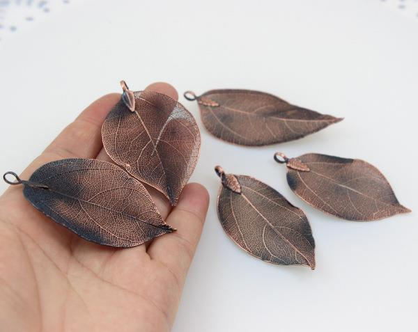 Efektowny liść wykonany z metalu w kolorze antycznej miedzi. Może służyć jako zawieszka na szyję, a także stanowić dodatek do większych projektów biżuteryjnych. Liść jest dość sztywny i gładki w dotyku. Ogniwo dość solidne i duże.
