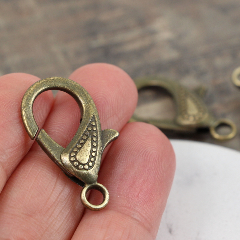 Duży karabińczyk metalowy w kolorze zielonym mosiężnym.
