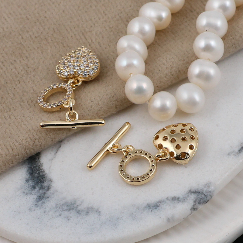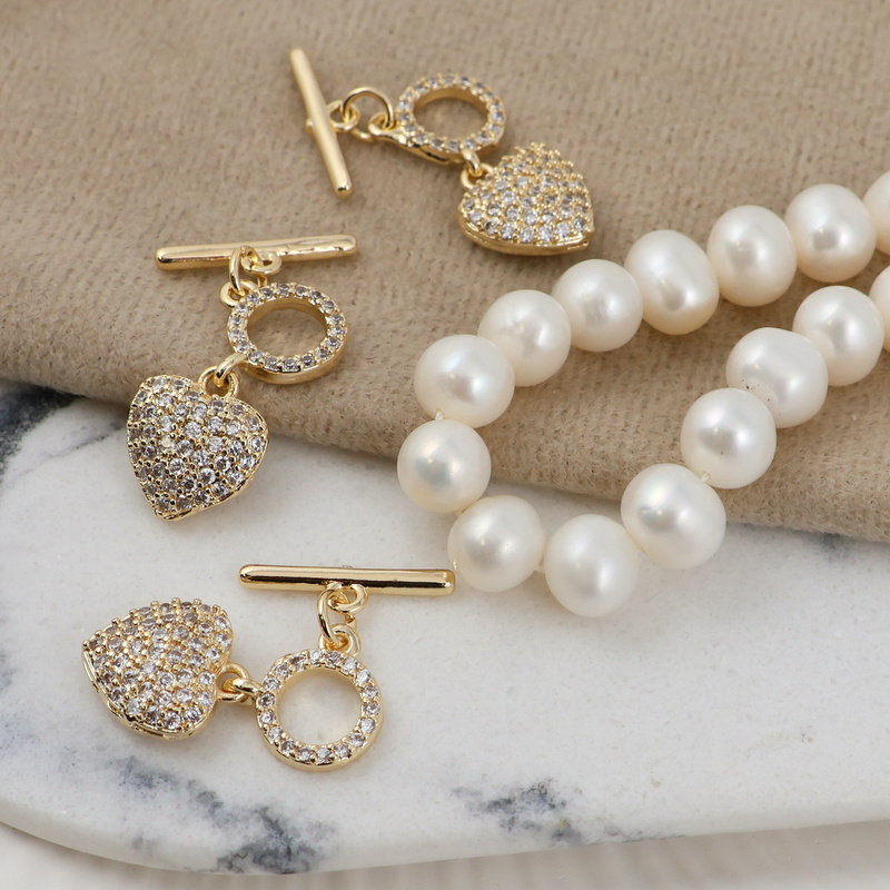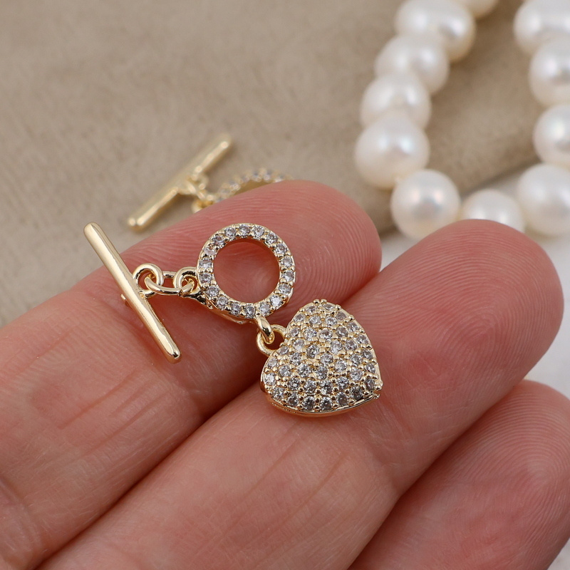 Zapięcie toggle z sercem z cyrkoniami mosiądz pozłacany 10mm