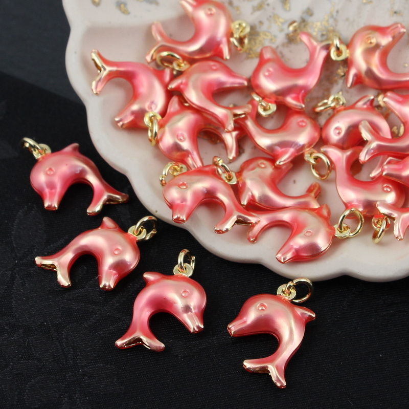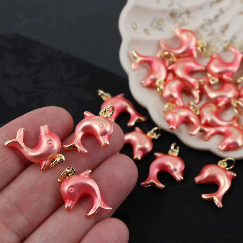 Zawieszka delfin mosiądz złocony emalia róż perłowy 19x13mm