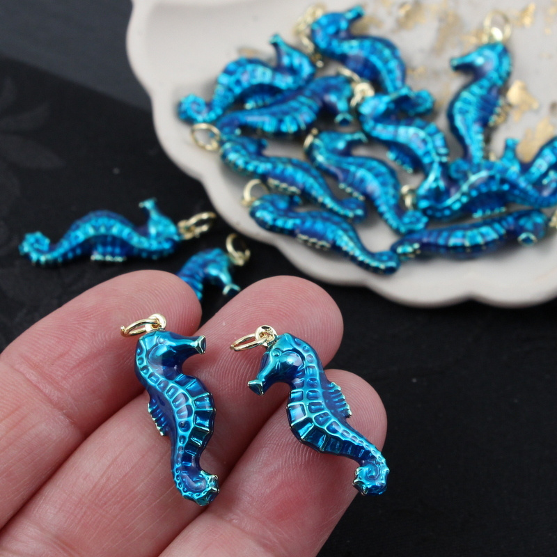 Urocza kolekcja zawieszek inspirowanych morskim klimatem. Koniki morskie / seahorse wykonane z lekkiego metalu (mosiądz złocony) i pokryte wyjątkową emalią o perłowo-metalicznym połysku, która przyciąga wzrok i dodaje biżuterii letniego blasku.