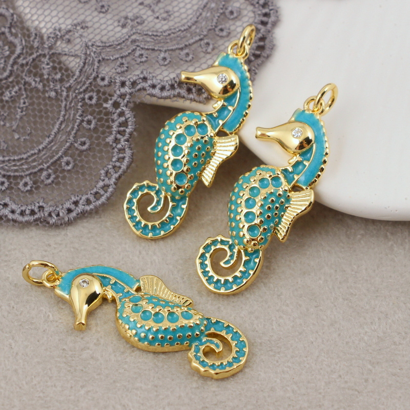 Zawieszki koniki morskie wykonane z mosiądzu, emaliowane jednostronnie.