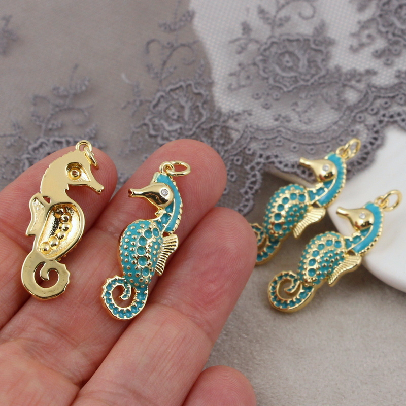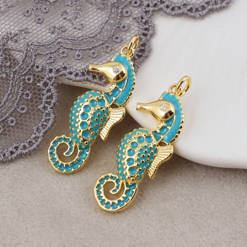 Zawieszka konik morski mosiądz złocony emaliowana turkusowa 30x11mm