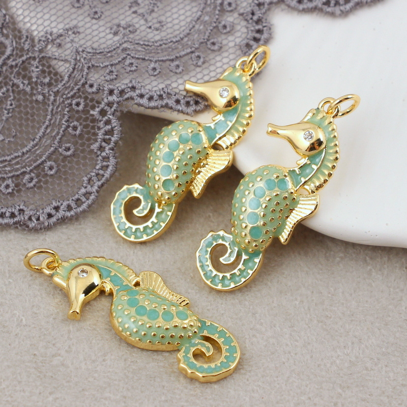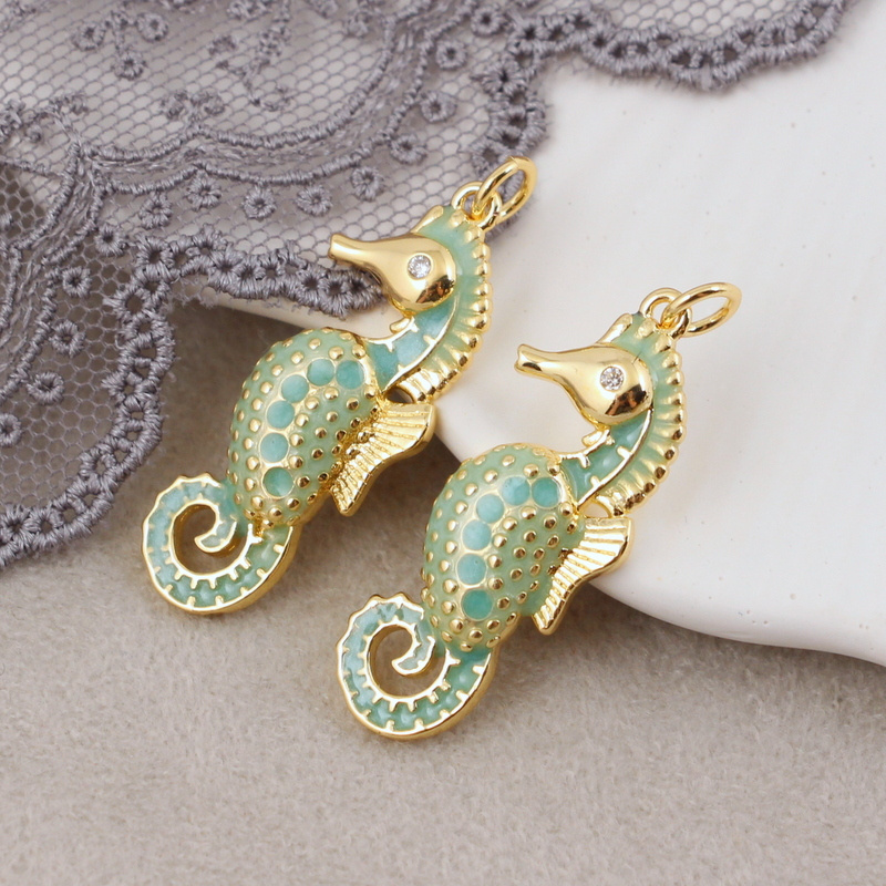 Zawieszka konik morski mosiądz złocony emaliowana zielona 30x11mm