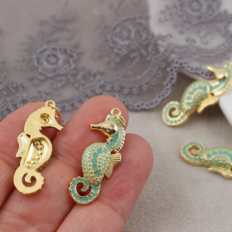 Zawieszki koniki morskie wykonane z mosiądzu, emaliowane jednostronnie.