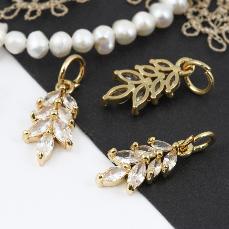 Zawieszka metalowa mosiądz złocony liść z cyrkoniami 17mm