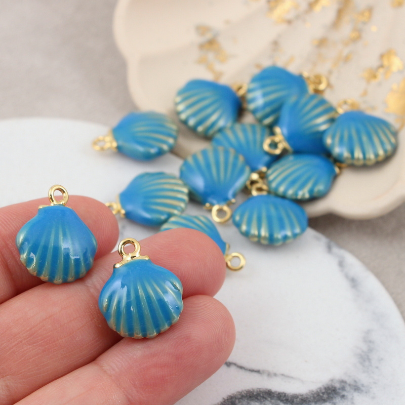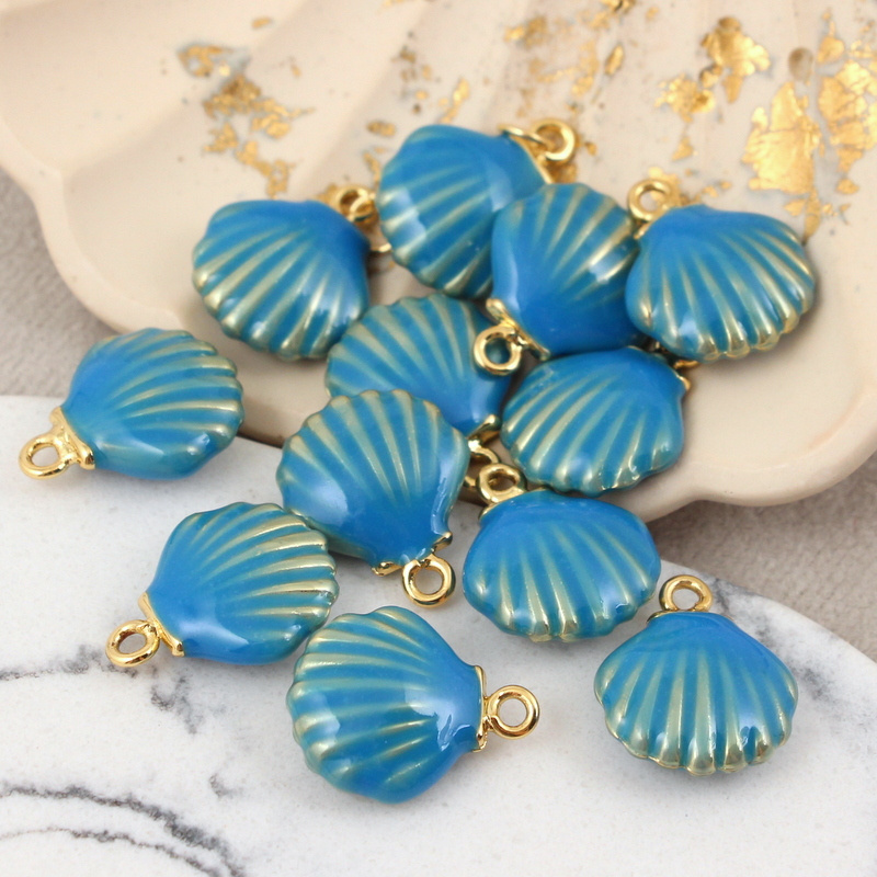 Turkusowa zawieszka inspirowanych morskim klimatem. Muszelki wykonane z metalu (mosiądz złocony) i pokryte wyjątkową emalią o perłowo-metalicznym połysku, która przyciąga wzrok i dodaje biżuterii letniego blasku.