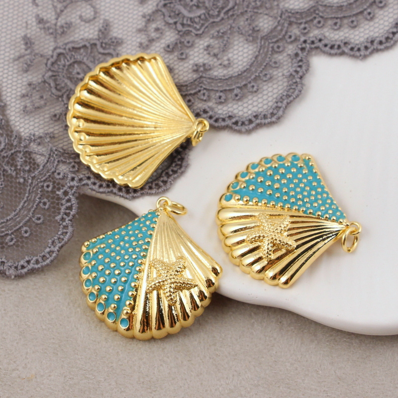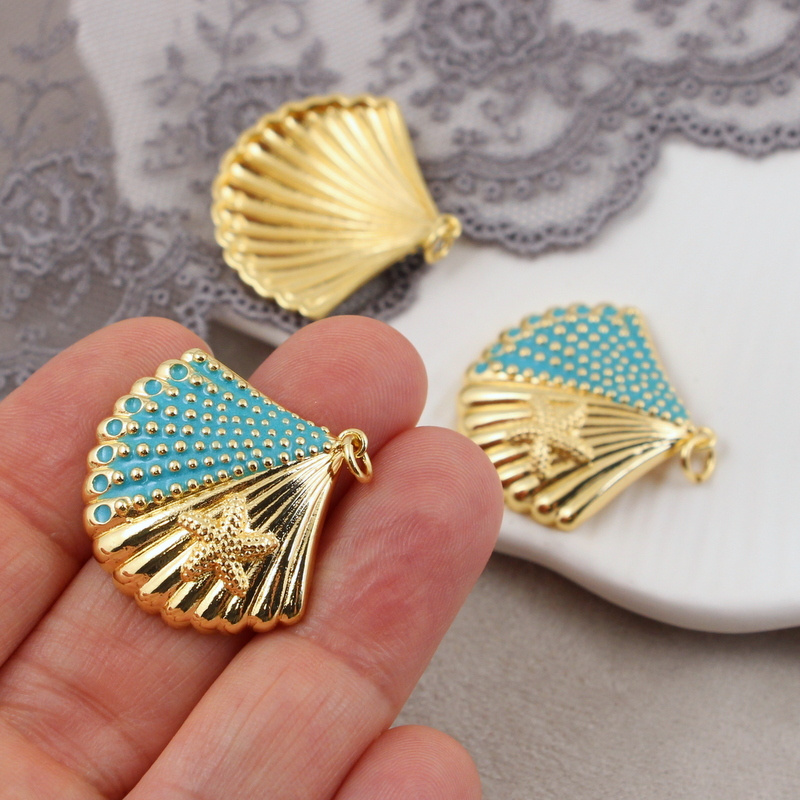 Zawieszka muszla mosiądz złocony emaliowana turkusowa 28mm