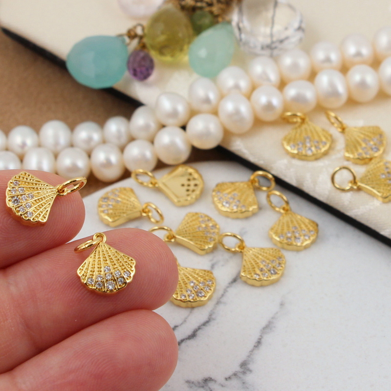Mała zawieszka w morskim klimacie. Muszelki wykonane z metalu (mosiądz złocony), wymiar ok. 10mm, zdobione cyrkoniami.
