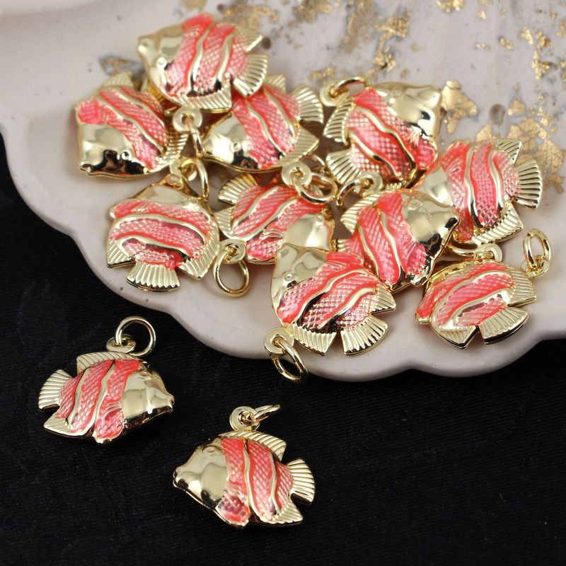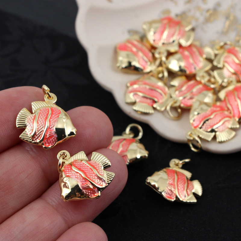 Urocza kolekcja zawieszek inspirowanych morskim klimatem. Rybki wykonane z lekkiego metalu (mosiądz złocony) i pokryte wyjątkową emalią o perłowo-metalicznym połysku, która przyciąga wzrok i dodaje biżuterii letniego blasku.