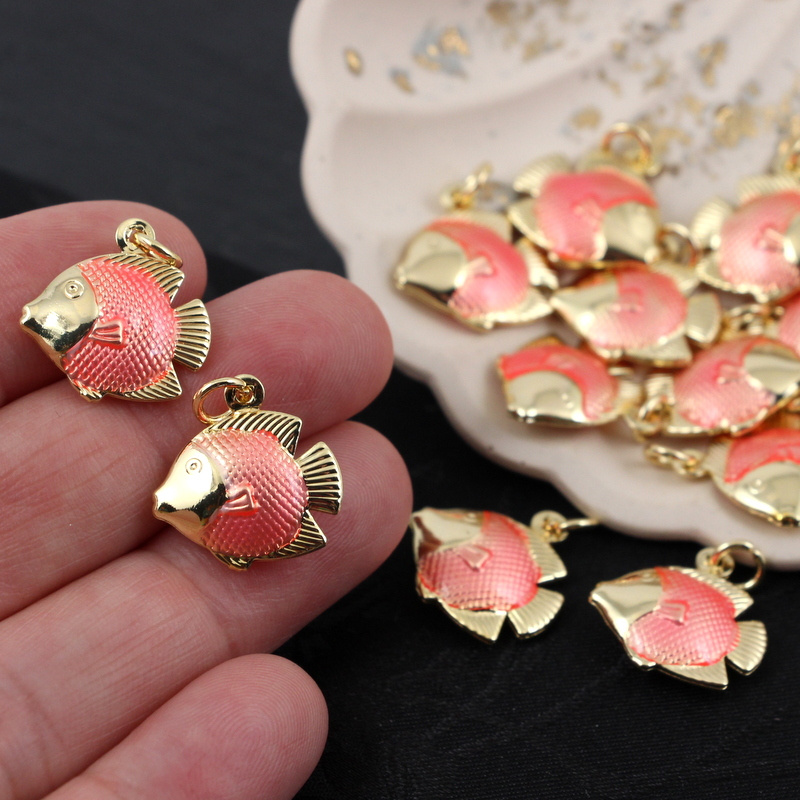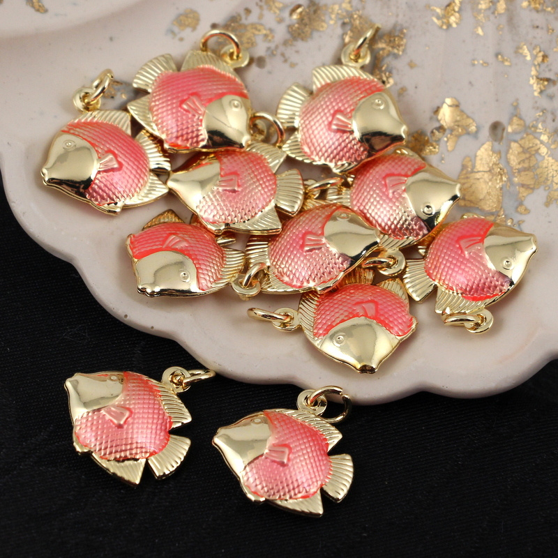 Urocza kolekcja zawieszek inspirowanych morskim klimatem. Rybki wykonane z lekkiego metalu (mosiądz złocony) i pokryte wyjątkową emalią o perłowo-metalicznym połysku, która przyciąga wzrok i dodaje biżuterii letniego blasku.