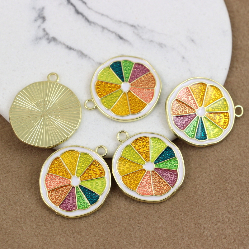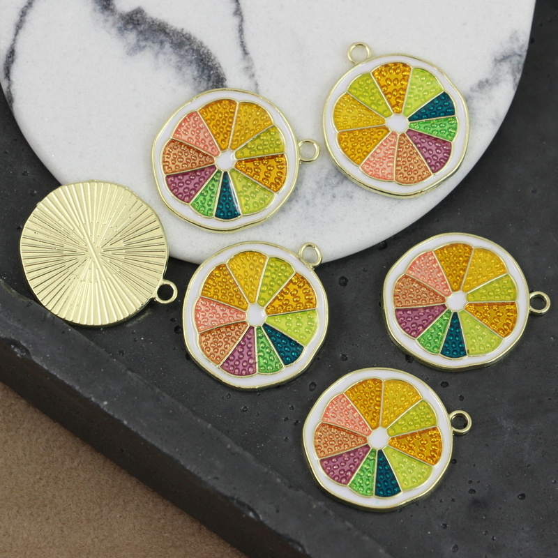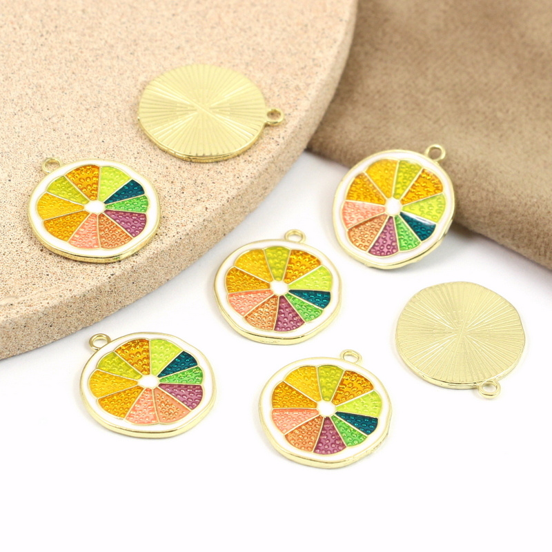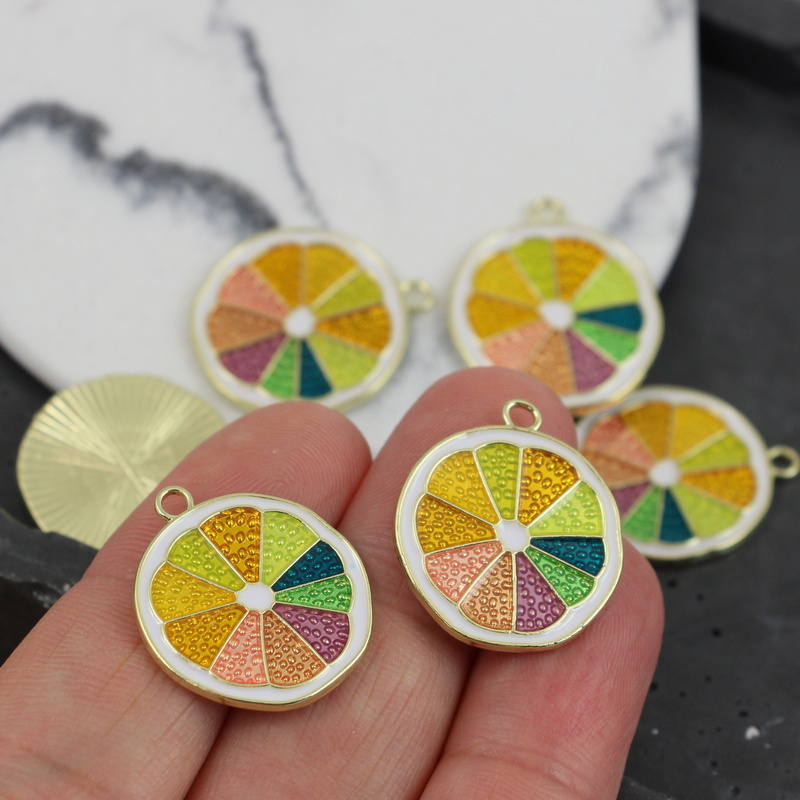 Zawieszka z motywem przekroju cytryny. Zawieszka ładnie wykonana. Doskonale uzupełni projekty biżuteryjne - bransolety czy naszyjniki.