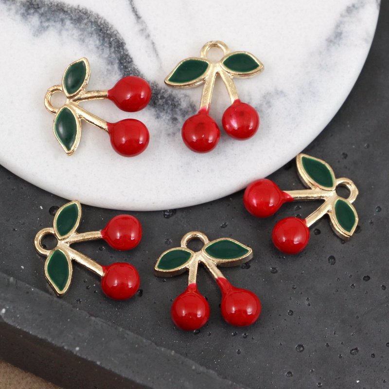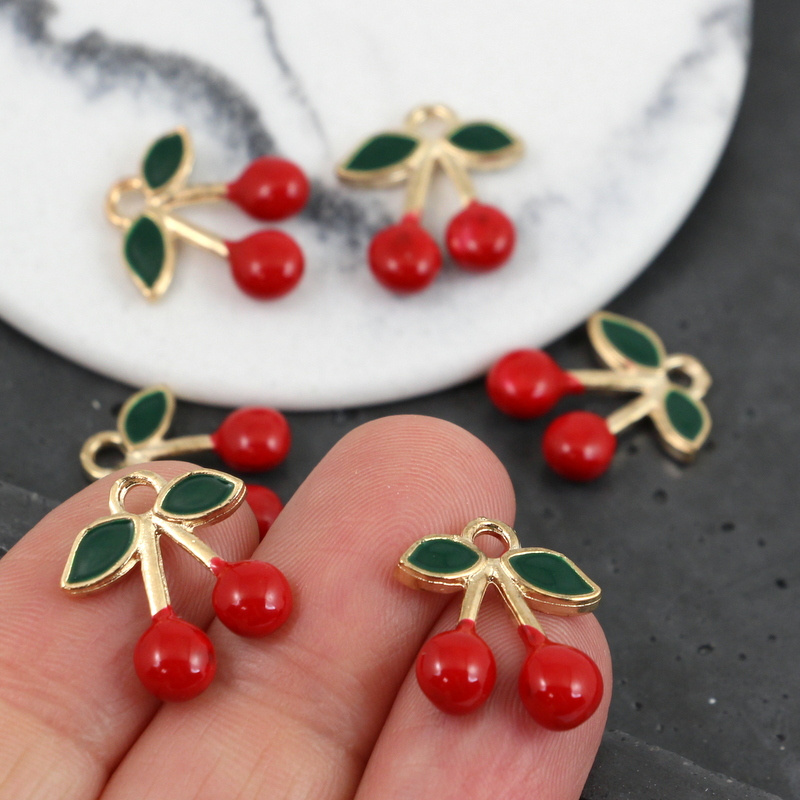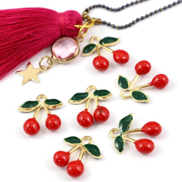 Zawieszka z motywem wiśni. Zawieszka ładnie wykonana, wiśnie są kształtne i okrągłe. Doskonale uzupełni projekty biżuteryjne - bransolety czy naszyjniki.