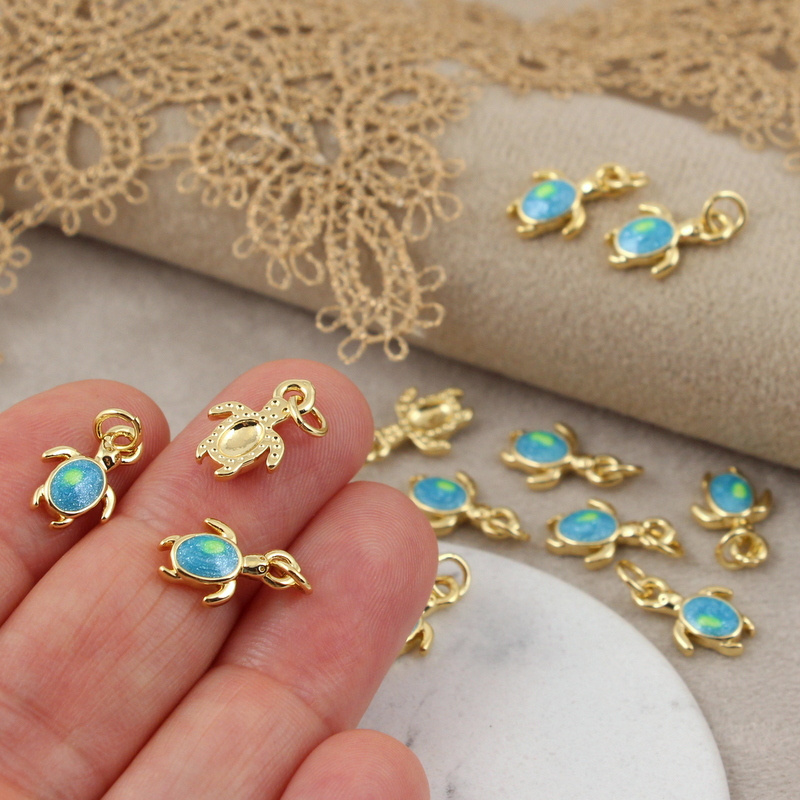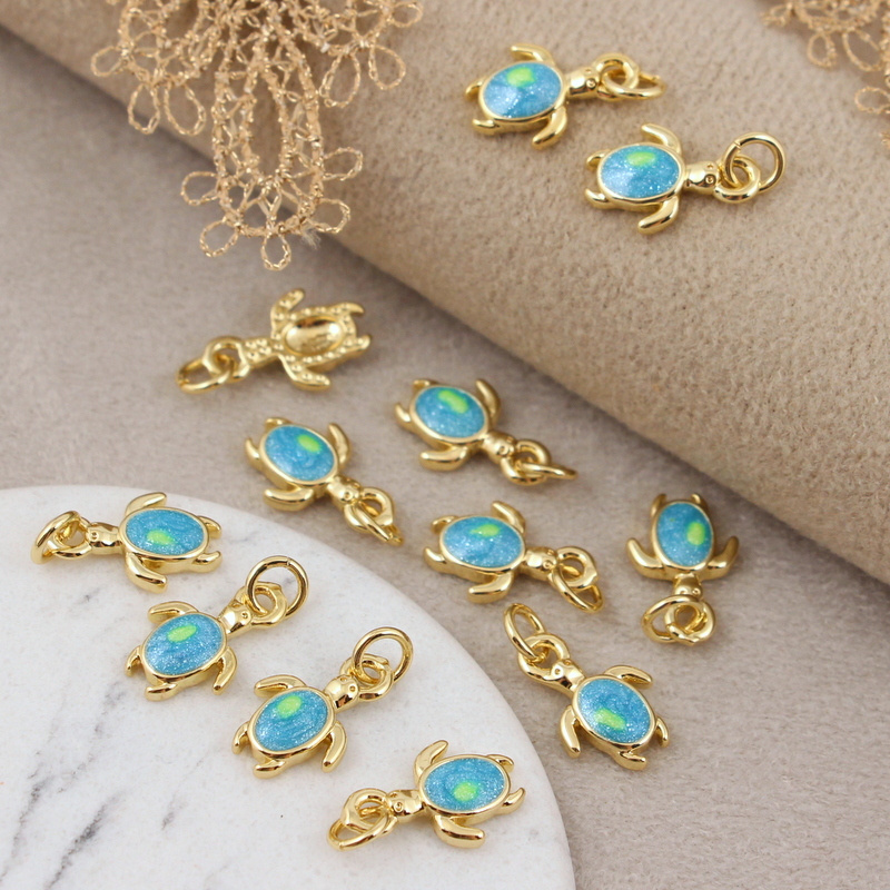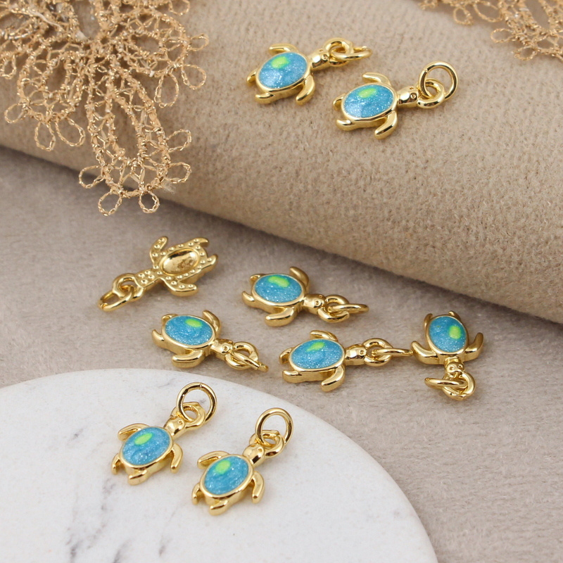 Zawieszki w kształcie morskiego żółwia, wykonane z mosiądzu, ze szklanym oczkiem w kolorze niebieskim.