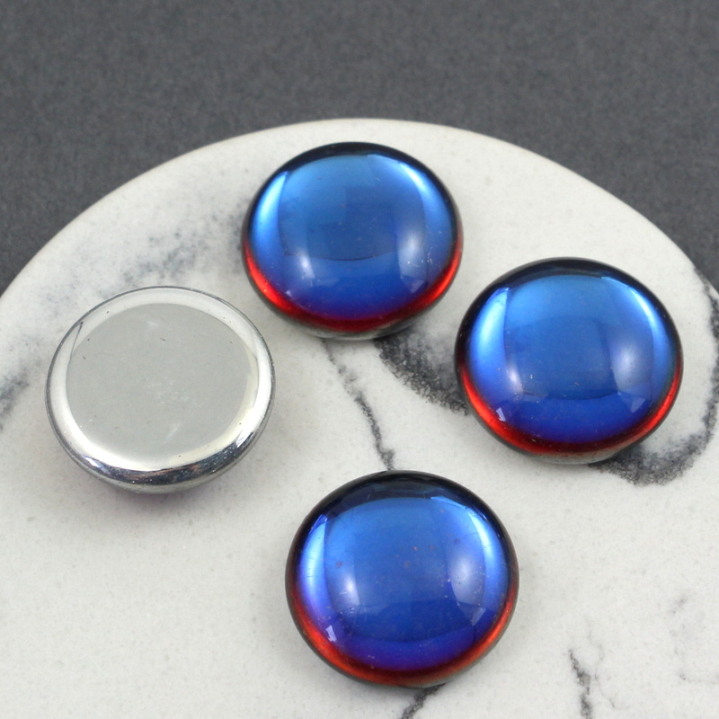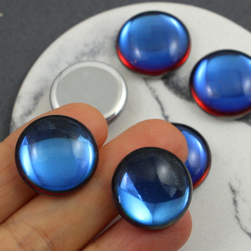 Szklane kaboszony w kształcie monety, powlekane od spodu srebrną folią. Pod kątem kaboszony mienią się tęczowo.