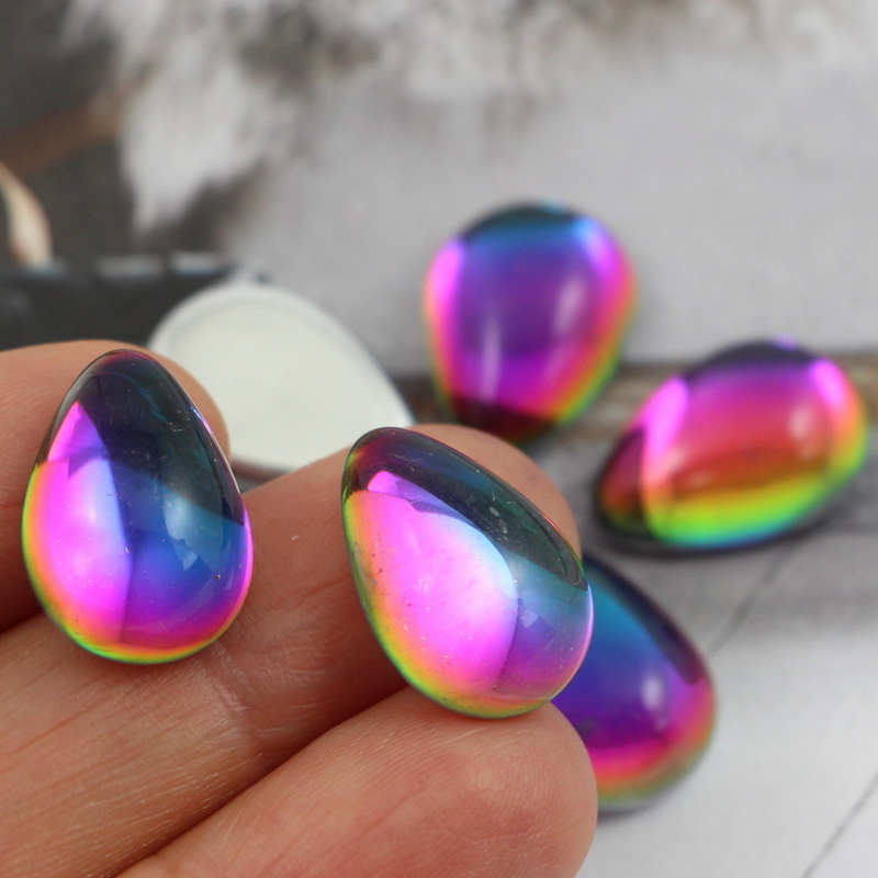 Szklane kaboszony w kształcie łezki, powlekane od spodu srebrną folią.