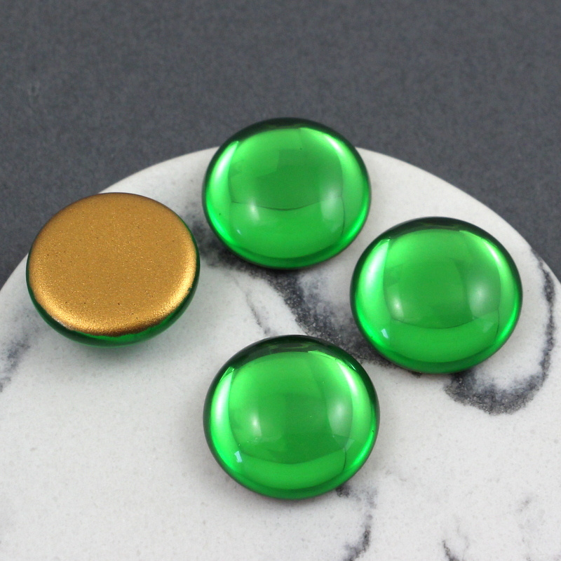 Szklane kaboszony w kształcie monety, powlekane od spodu złotą folią.