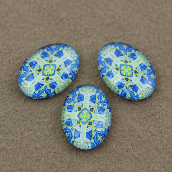 OpisKaboszon szklany w kształcie owalnym. Wypukłe szkiełka z podklejoną od spodu grafiką (spód płaski).