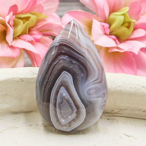 Kaboszon agatu botswana z charakterystycznym dla tej odmiany wzorem wstęgi. Obustronnie polerowany, spód płaski.