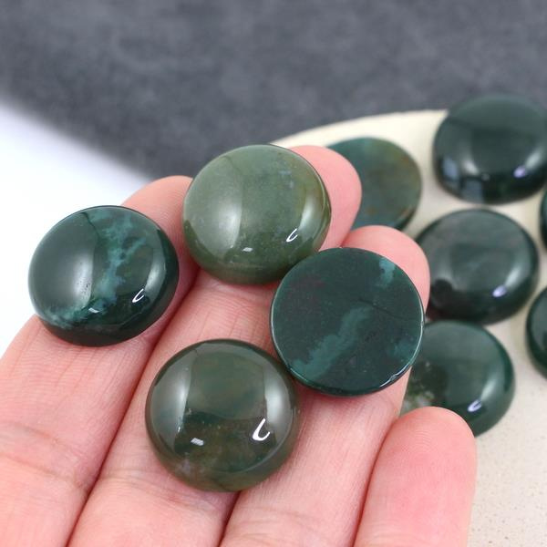 OpisOkrągłe kaboszony agatu mszystego w odcieniach zieleni.