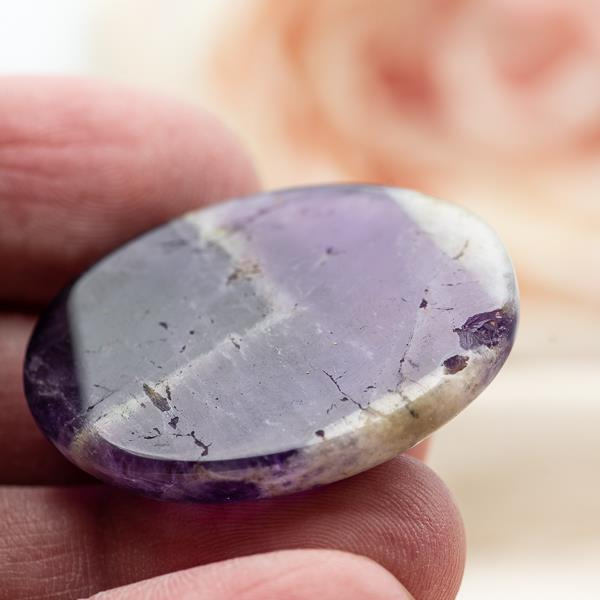 OpisAmetyst szewronowy w postaci kaboszonu, spód płaski.