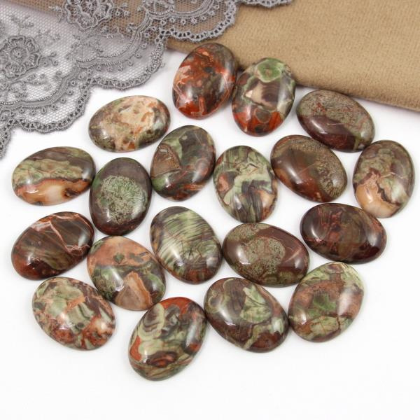Duże kaboszony jaspisu w kolorach zielono-brązowych.
