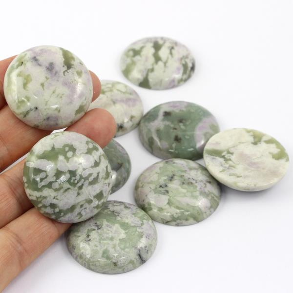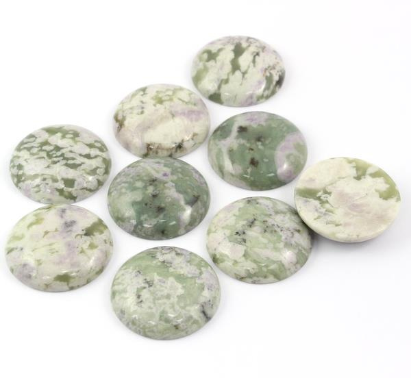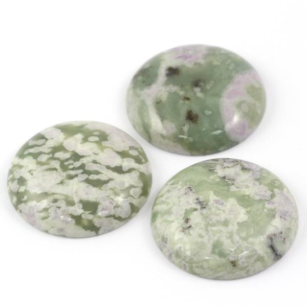 Okrągły, duży kaboszon naturalnego jaspisu w kolorach pastelowej zieleni, kremu i szczypty fioletu.