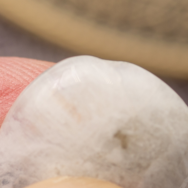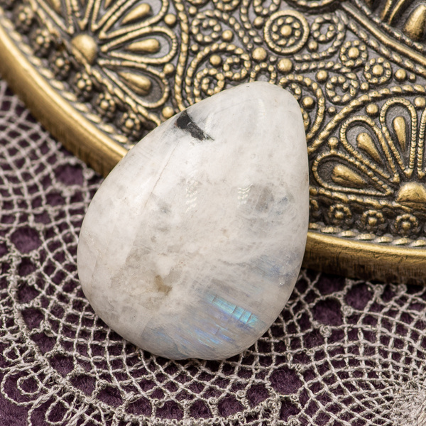 Kaboszon naturalnego kamienia księżycowego. Polerowany obustronnie, spód płaski. Na dole kaboszonu mały ubytek zapolerowany w szlifierni widoczny na fot. 2. Wymiar: 25x19x6mm.