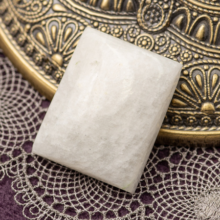 Kaboszon naturalnego kamienia księżycowego. Polerowany obustronnie, spód płaski. Wymiar: 27x22x7mm.