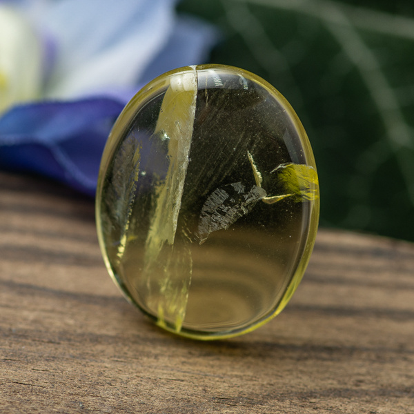 Kaboszon naturalnego kwarcu cytrynowego. Polerowany obustronnie, spód płaski. Wymiar: 21x17x4mm.