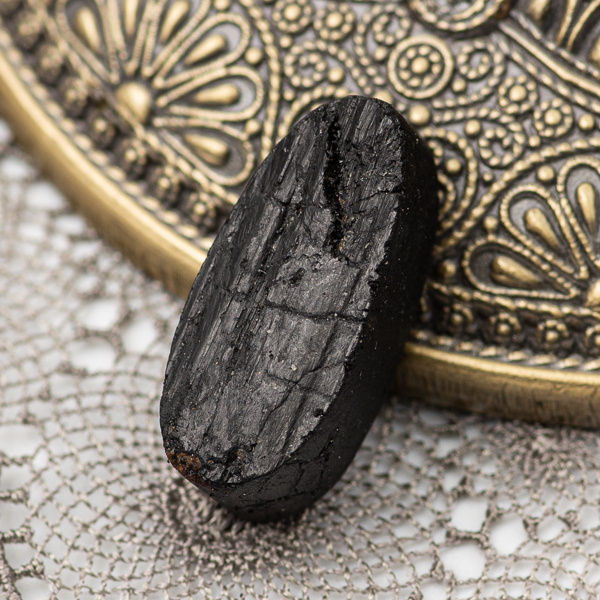 Kaboszon naturalnego czarnego turmalinu. Druza, spód płaski. Wymiar: 25x12x9mm.