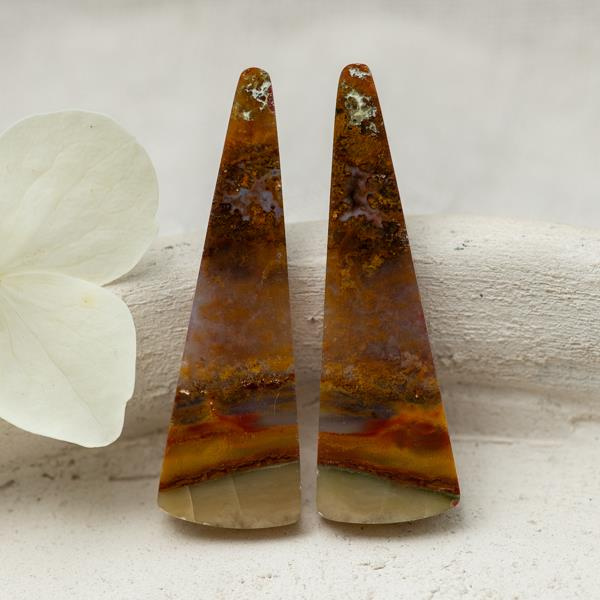 OpisKaboszony naturalnego jaspisu. Strona przednia lekko wypukła. Spody płaskie. Wszystkie powierzchnie polerowane. Przedmiotem sprzedaży jest komplet dwóch kaboszonów widocznych na zdjęciu. Wymiar 1 sztuki: 40x12x3mm Idealne na wyjątkowe kolczyki.