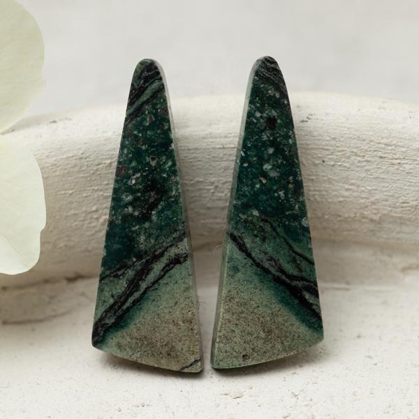 OpisKaboszony naturalnego jaspisu mszystego. Strona przednia lekko wypukła. Spody płaskie. Wszystkie powierzchnie polerowane. Przedmiotem sprzedaży jest komplet dwóch kaboszonów widocznych na zdjęciu. Wymiar 1 sztuki: 31x11x3mm Idealne na wyjątkowe kolczyki.