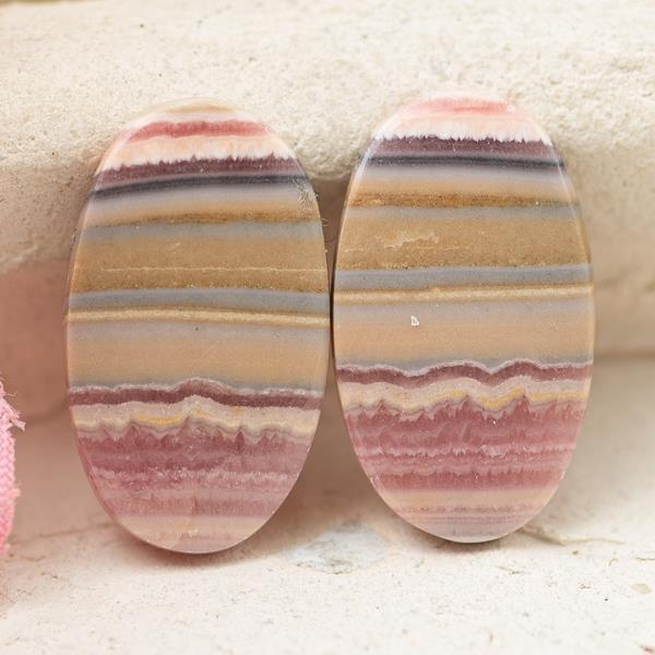 OpisKaboszony naturalnego rodochrozytu. Strona przednia lekko wypukła, polerowana. Spody płaskie szlifowane. Możliwe drobne różnice w wymiarze obu egzemplarzy. Przedmiotem sprzedaży jest komplet dwóch kaboszonów widocznych na zdjęciu. Wymiar 1 sztuki: 18x10x2mm. Idealne na wyjątkowe kolczyki.
