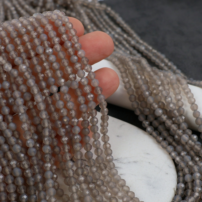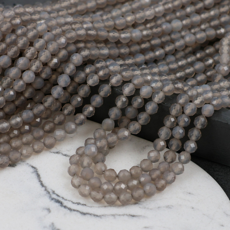 Sznur drobnych, fasetowanych kulek szarego agatu.