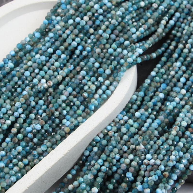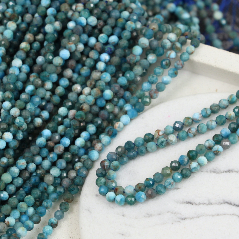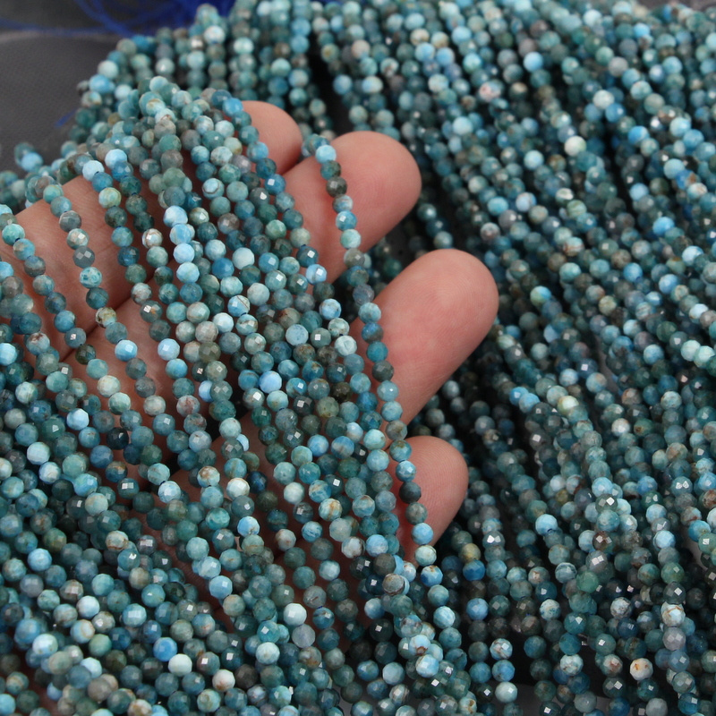 Fasetowane kulki apatytu w morskim odcieniu niebiesko-zieleni.