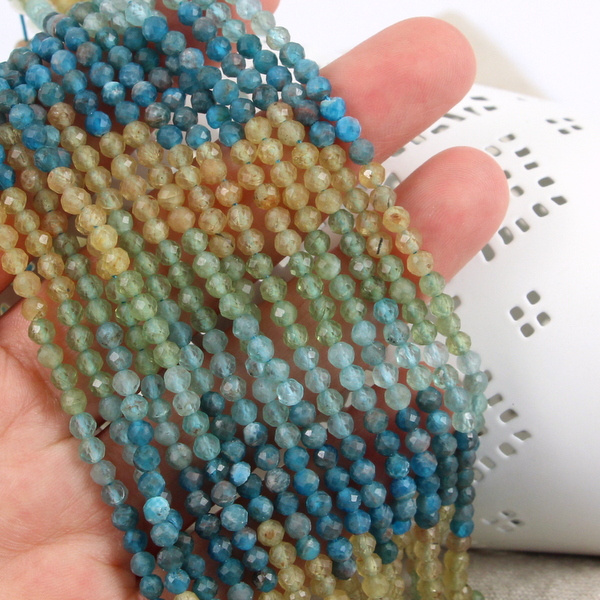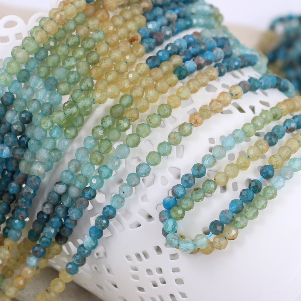 Fasetowane kulki apatytu w kolorze zielonym, żółtym i niebieskim.