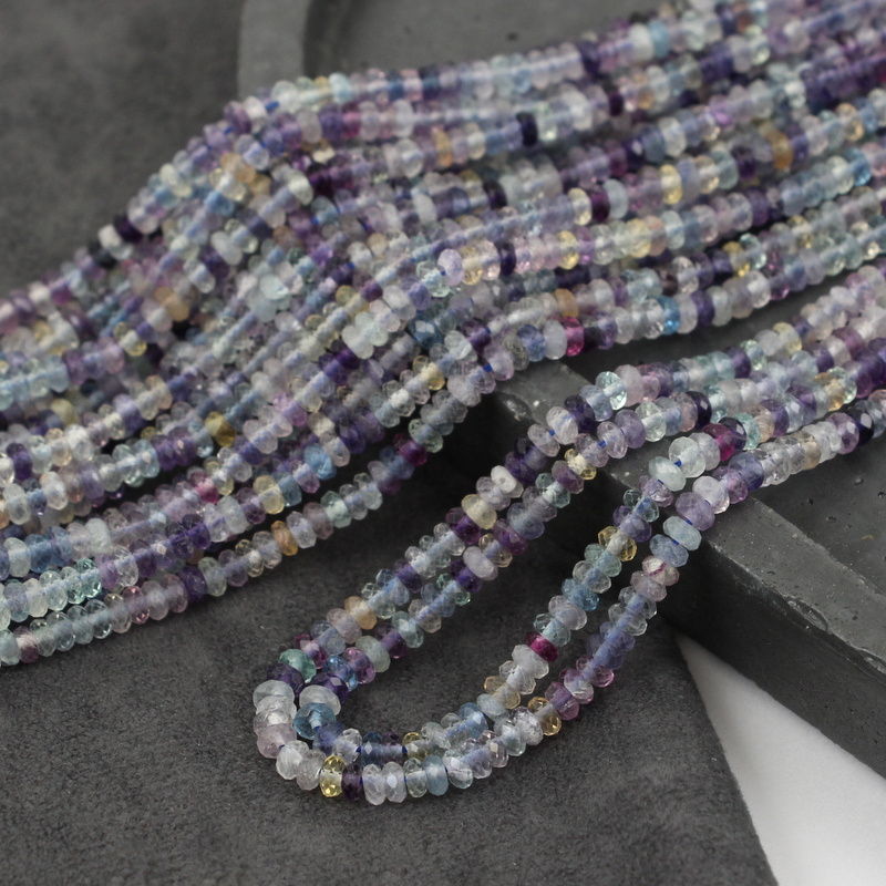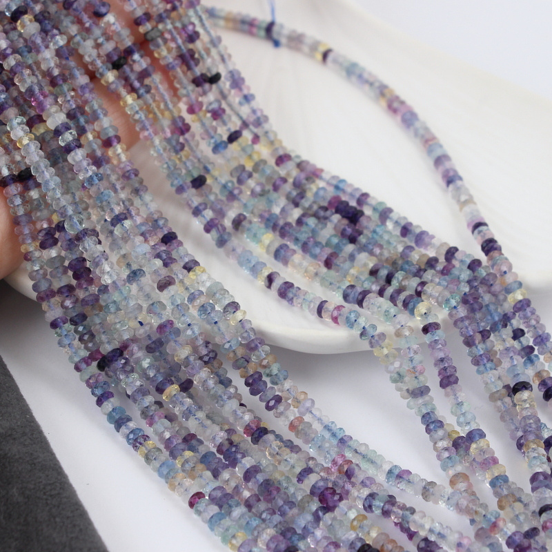 Naturalny fluoryt tęczowy w kształcie fasetowanych oponek/dysków. Różne kolory na sznurze.