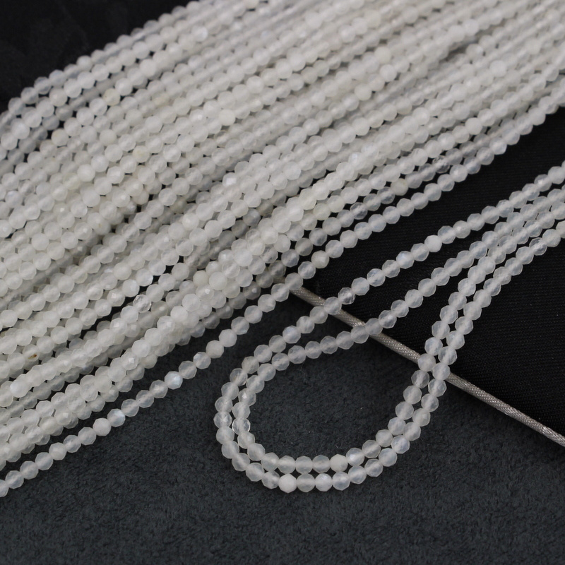 Sznur drobnych, fasetowanych kulek kamienia księżycowego.