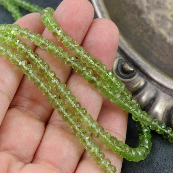 OpisWysokiej jakości, fasetowane oponki czystego peridotu. Kamienie bez wtrąceń.
