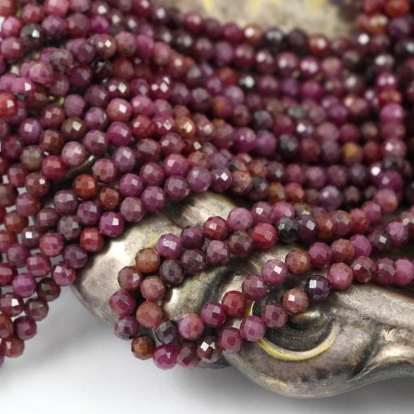 OpisSznur drobnych szlifowanych kuleczek naturalnego rubinu w ciemnym kolorze.
