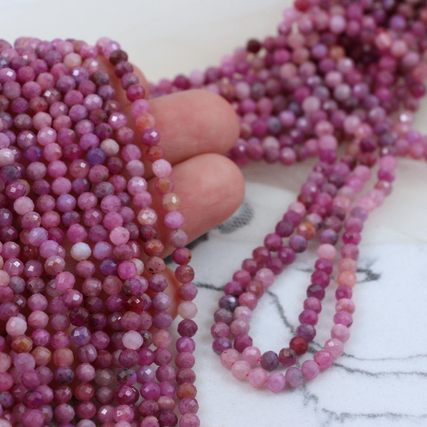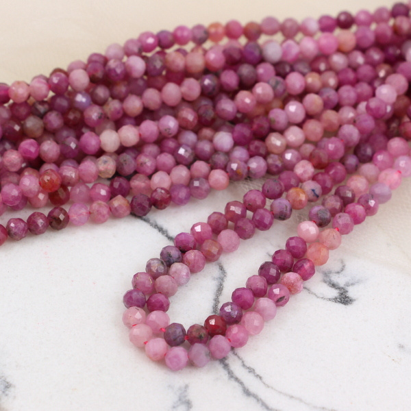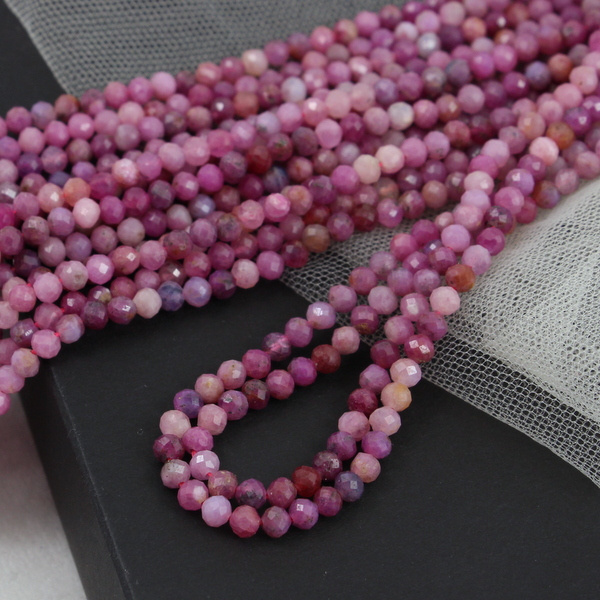 Sznur szlifowanych kuleczek naturalnego rubinu, wiele kulek ma jasną tonację, co czyni kamienie tańszymi niż klasyczny rubin o nasyconej barwie.