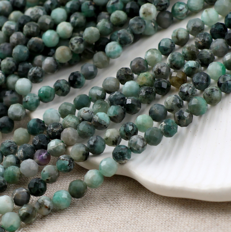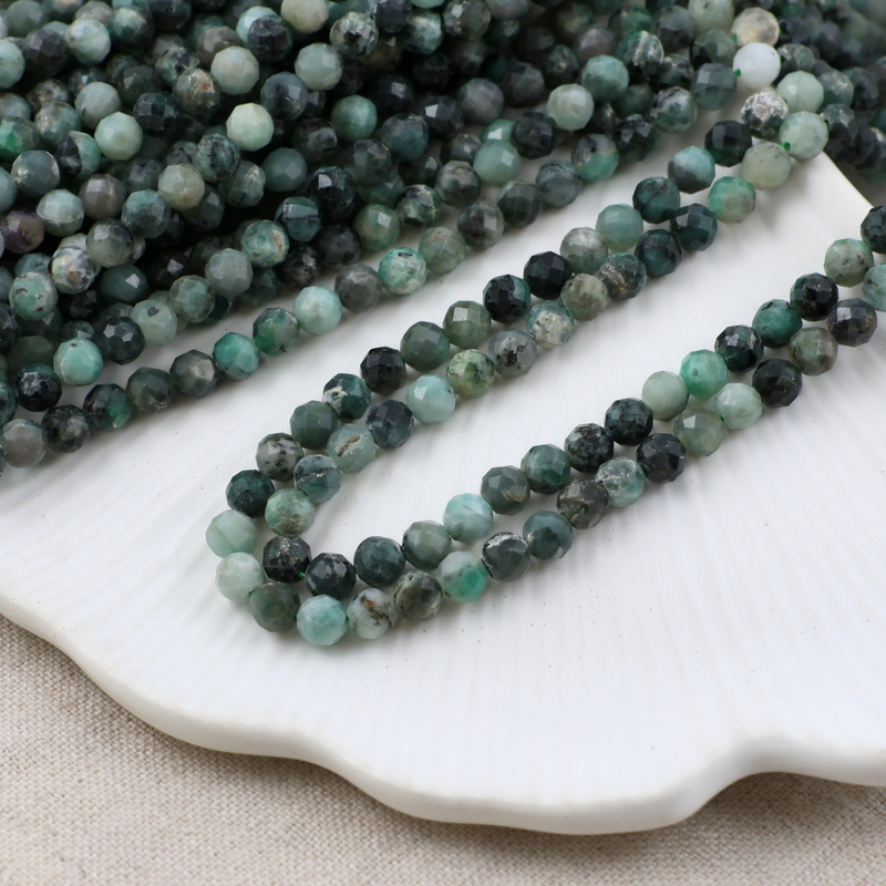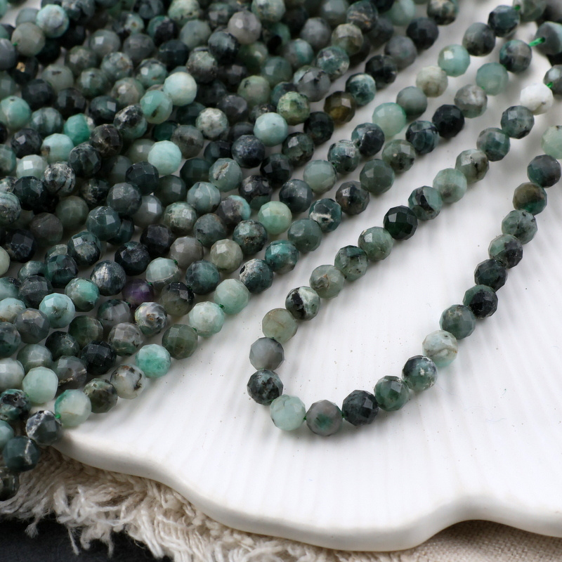 Małe, fasetowane kulki naturalnego szmaragdu, niska cena wynika z jakości kamieni, mają ciemny odcień zieleni, są mętne z dużą ilością ciemnych wtrąceń.