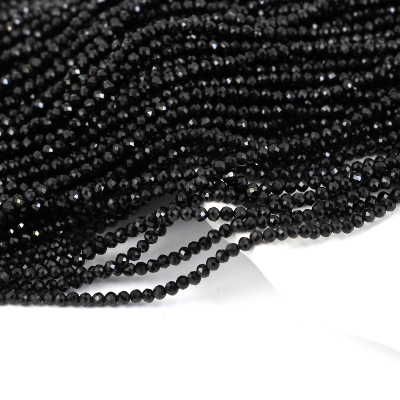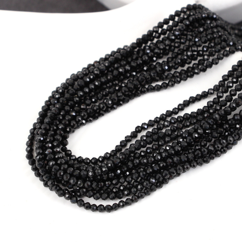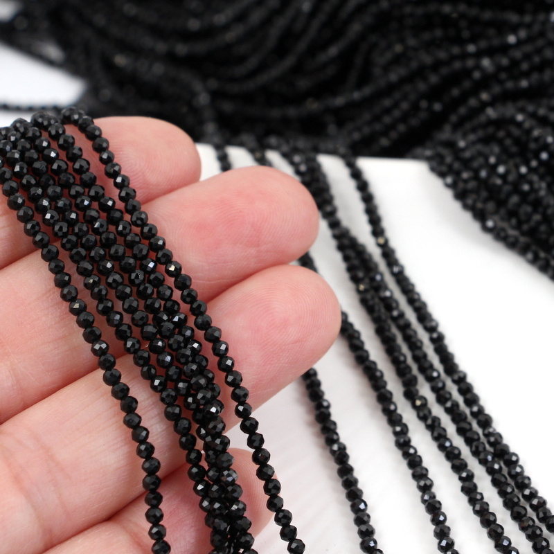 Fasetowane kule naturalnego czarnego turmalinu o średnicy ok. 2,2mm - cały sznur ok. 39cm.