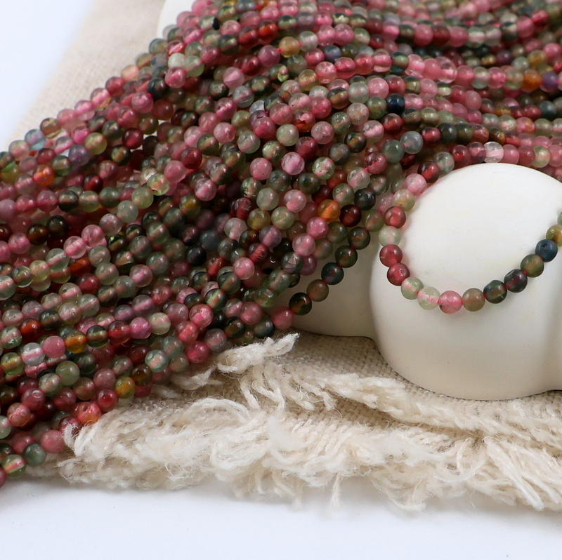 Gładkie kuleczki turmalinu wielokolorowego w jasnych i ciemnych różach.