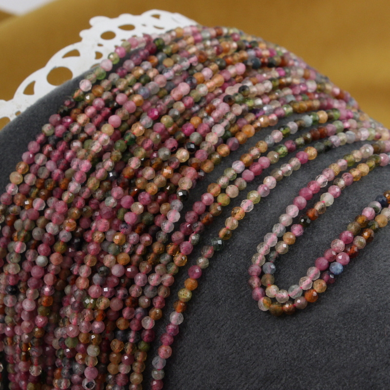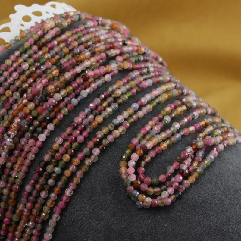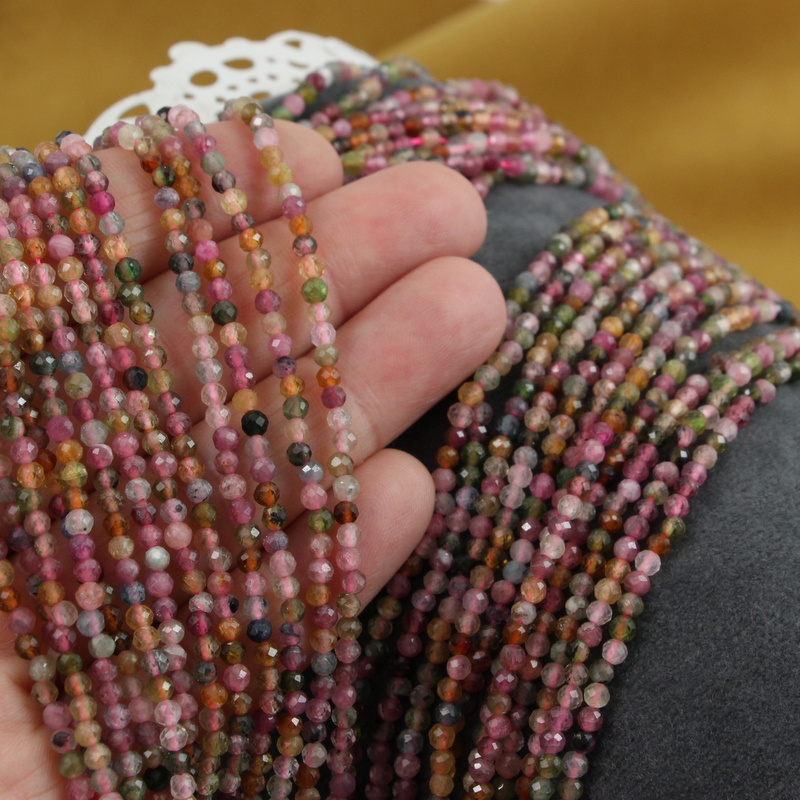 Kamienie kolorowego turmalinu o fasetowanej powierzchni. Turmalin wielobarwny tworzy energetyczny mix, świetnie wygląda na opalonej skórze i ciemnej karnacji.